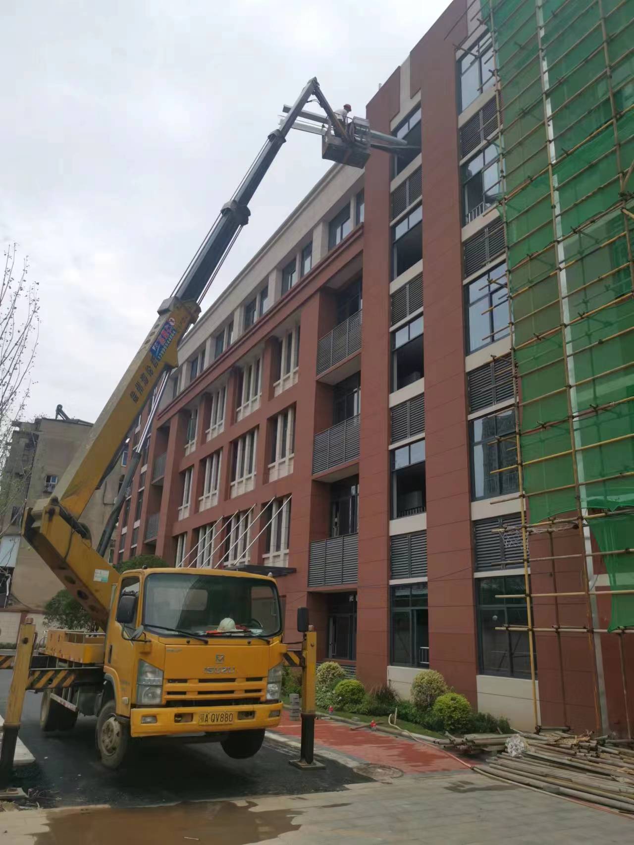 22米升降车外墙修补瓷砖施工现场