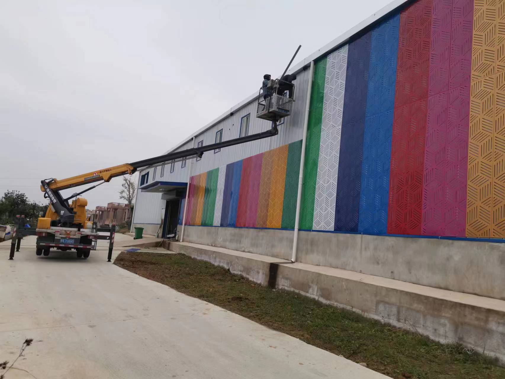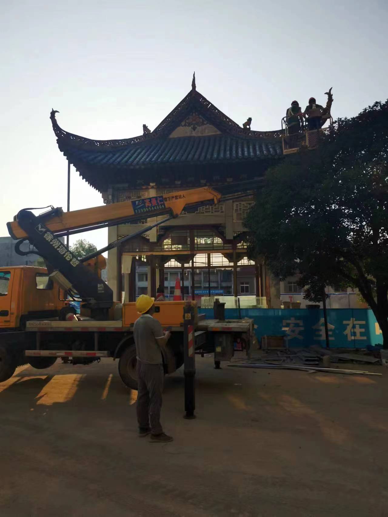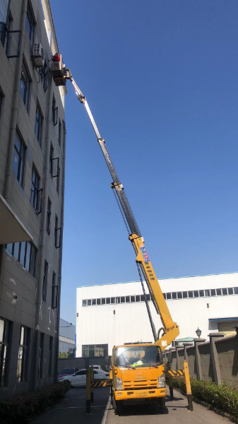 24米登高车安装装饰牌施工现场