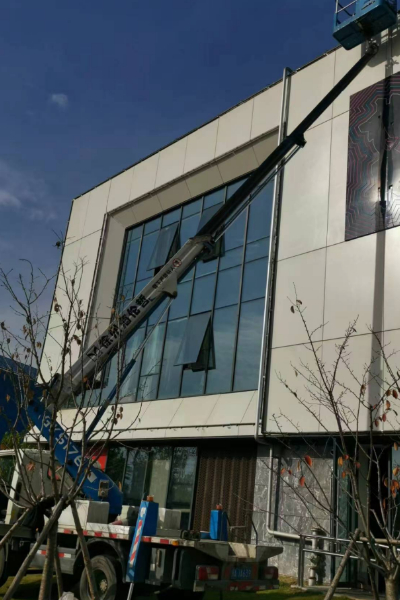 22米高空作业车玻璃幕墙安装广告字…